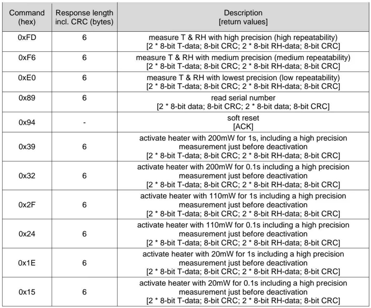 5、加熱器一旦啟用就會(huì)產(chǎn)生大量電流(最高可達(dá)75mA)。雖然專用電路能平穩(wěn)地吸收電流,但電源功率必須足夠大,以避免電壓過低而引起的傳感器復(fù)位。如果需要更高的加熱溫度,則必須向傳感器發(fā)送連續(xù)的加熱命令。加熱器只能在低于65℃的環(huán)